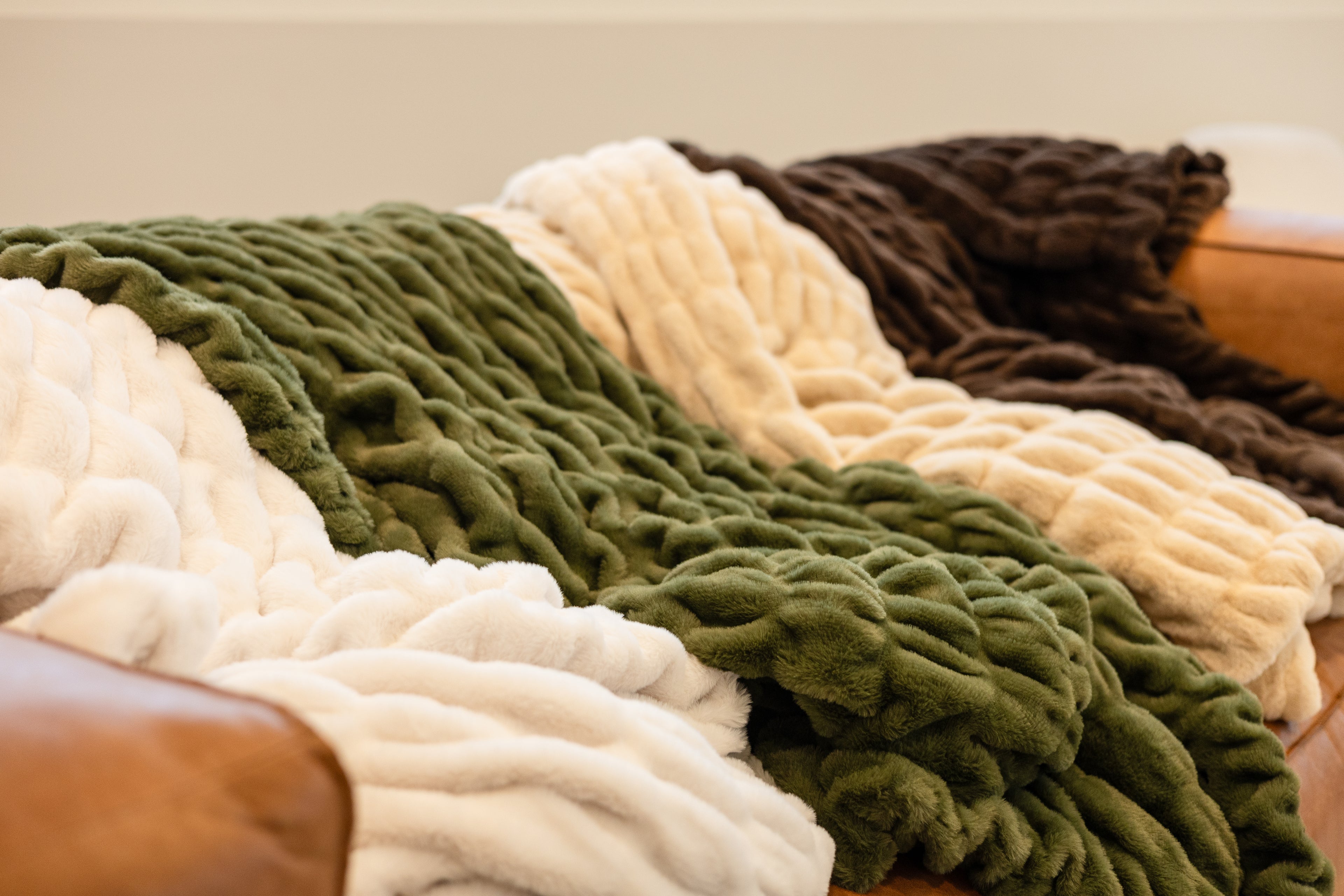 Crafted from ultra-plush faux rabbit fur, our blankets are silky soft, cruelty-free, and quilted in a chic bubble texture for luxury and breathability. Durable yet drapable, they elevate any space with a modern, cozy touch.Weighted enough to feel grounding but light enough to stay breathable, each blanket wraps you in cloud-like comfort. Soft, stylish, and seasonless - they’re made for cuddling, napping, and adding effortless elegance to your home.